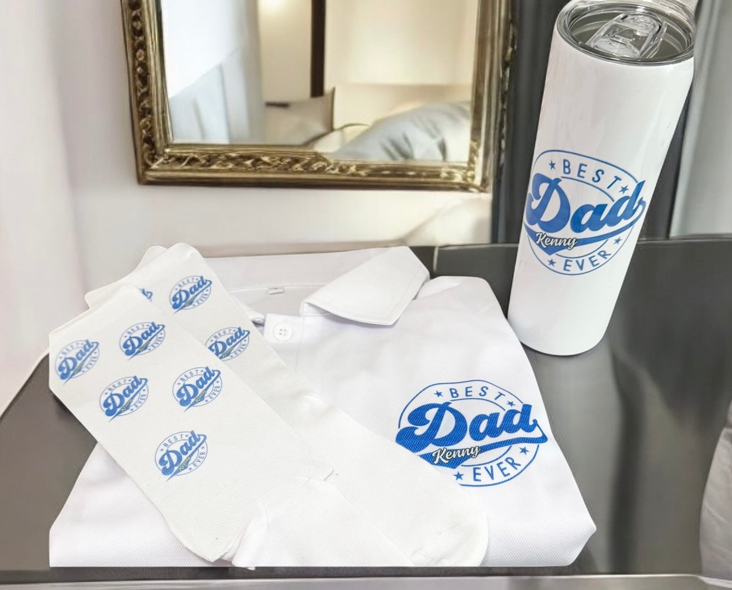 Celebrate Dad in style with this sleek and meaningful gift set. Featuring a crisp white polo shirt, matching socks, and a stainless steel tumbler—each item is customized with the bold “Best Dad Ever” design and personalized with his name. This coordinated set combines comfort, practicality, and heartfelt appreciation—making it the perfect Father’s Day surprise for the dad who does it all.