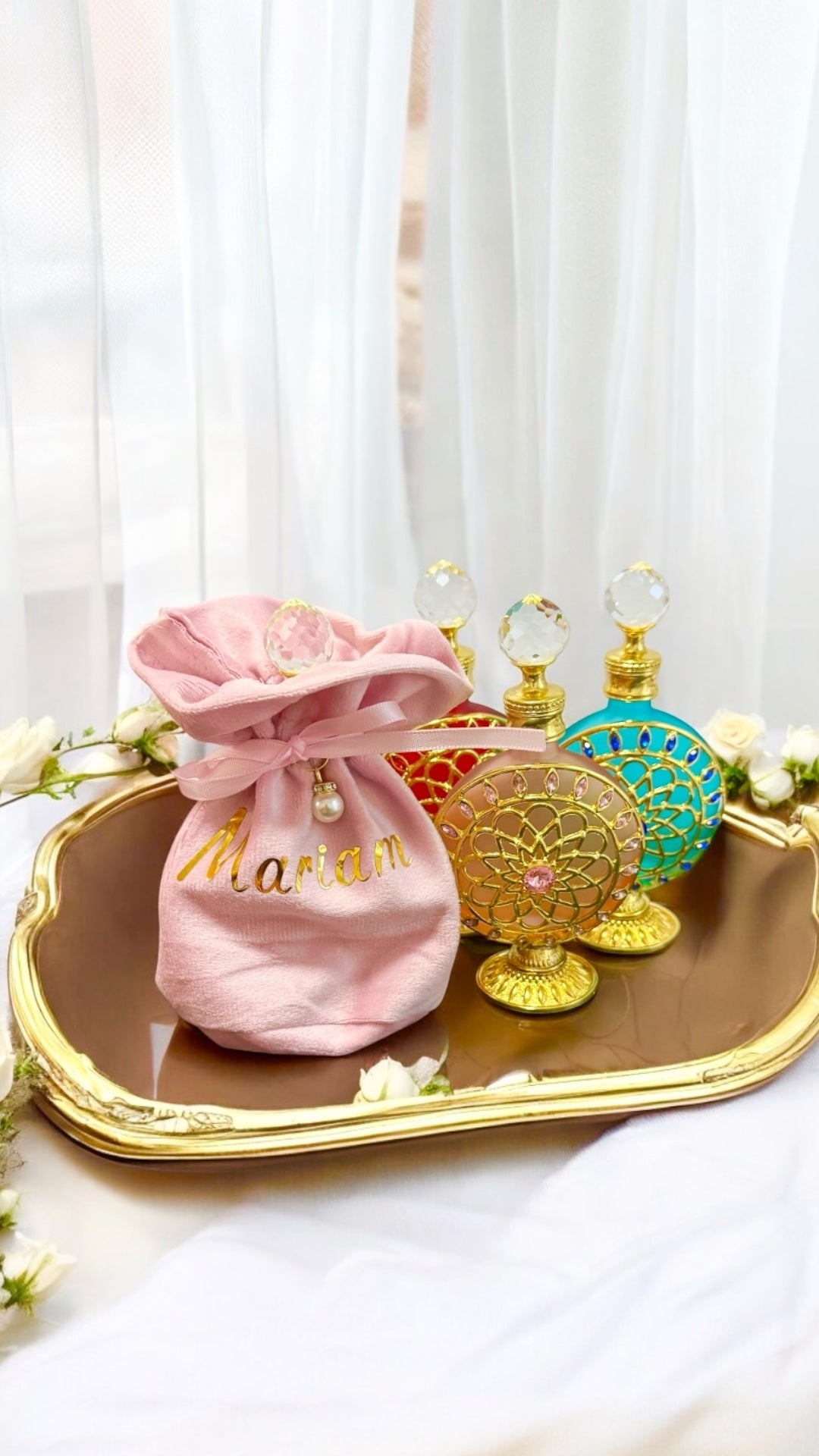 -A beautifully bottled fragrance oil imported from Dubai nestled in a personalized luxury velvet pouch.