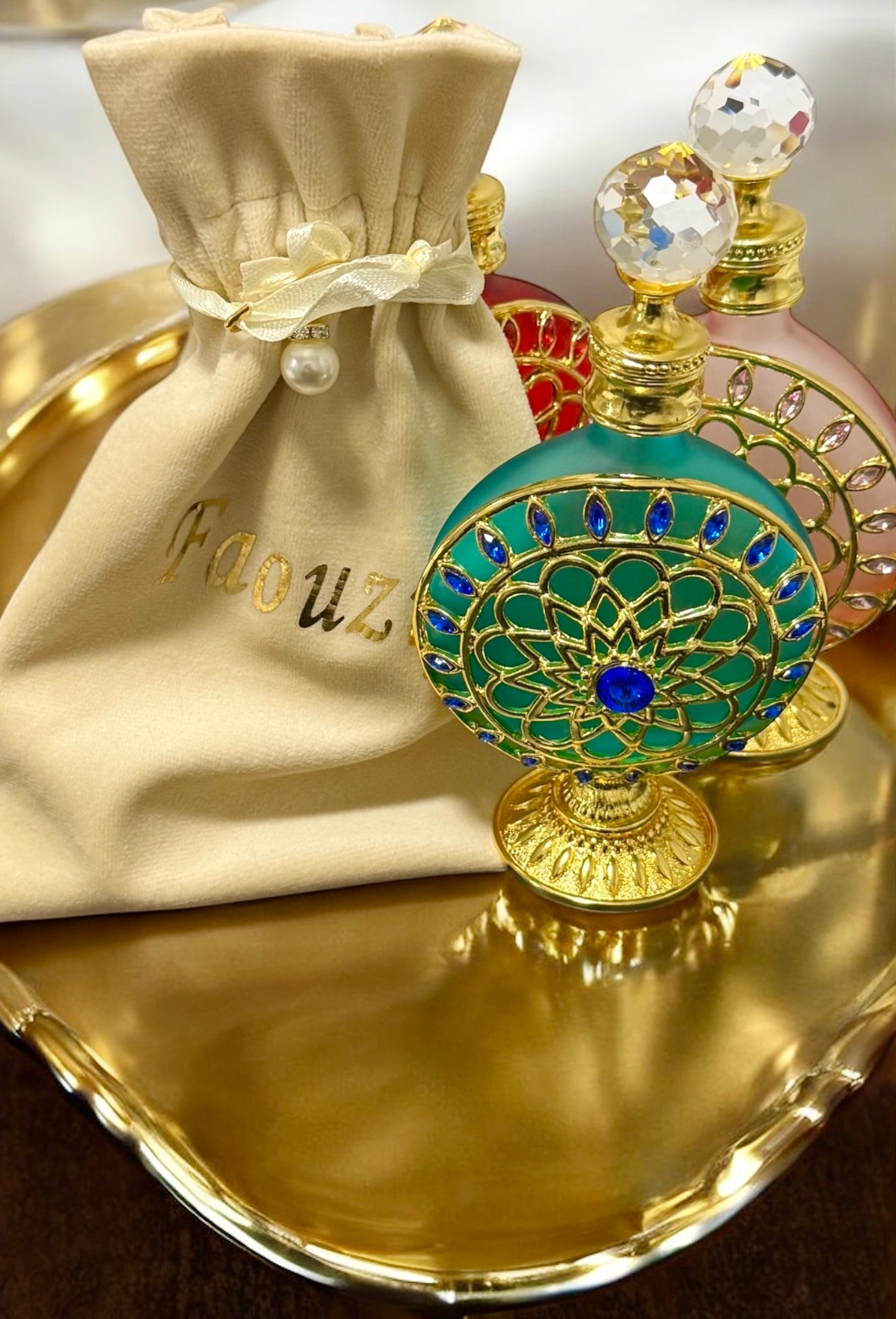 -A beautifully bottled fragrance oil imported from Dubai nestled in a personalized luxury velvet pouch.