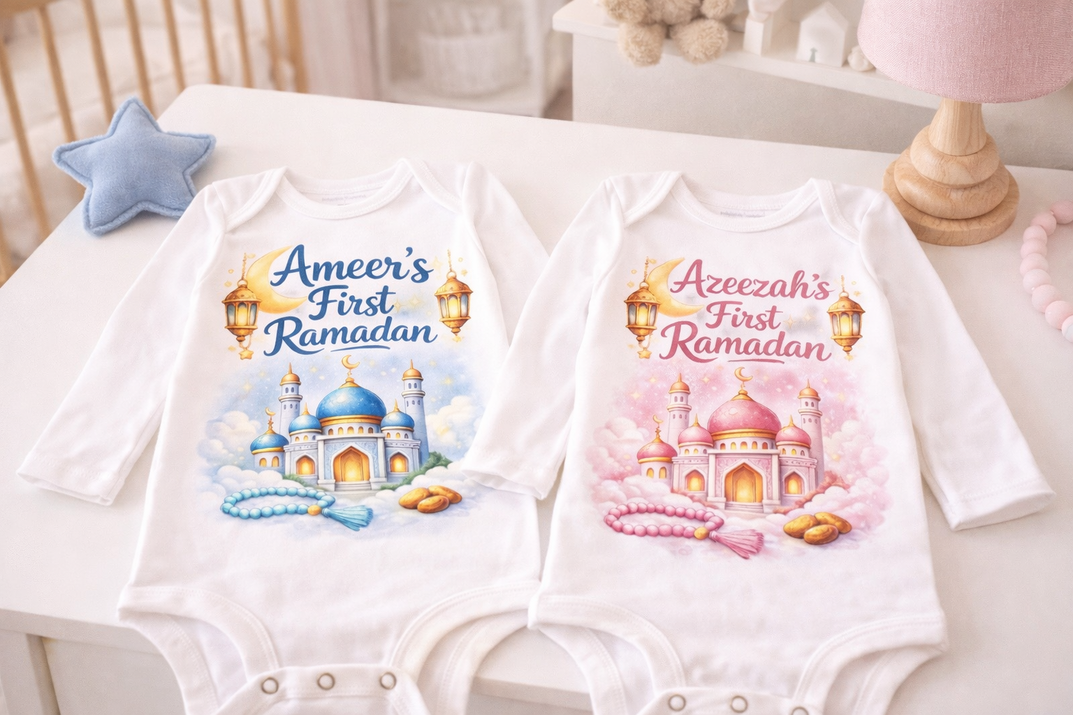 - “First Ramadan” design with mosque, lanterns & crescent moon