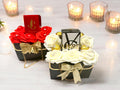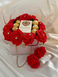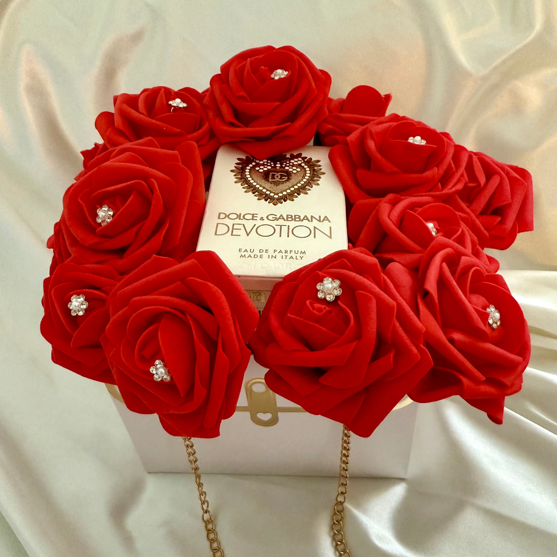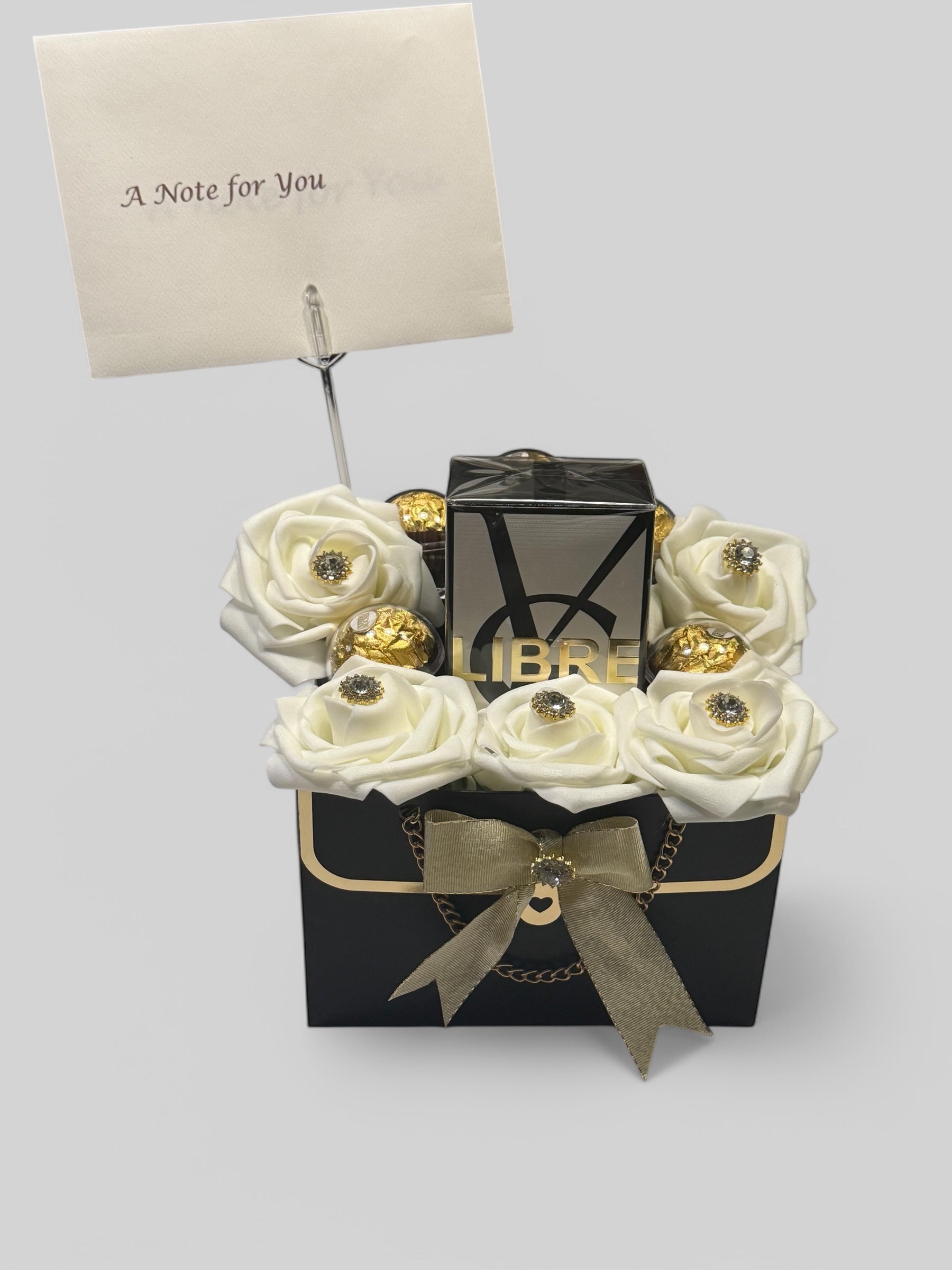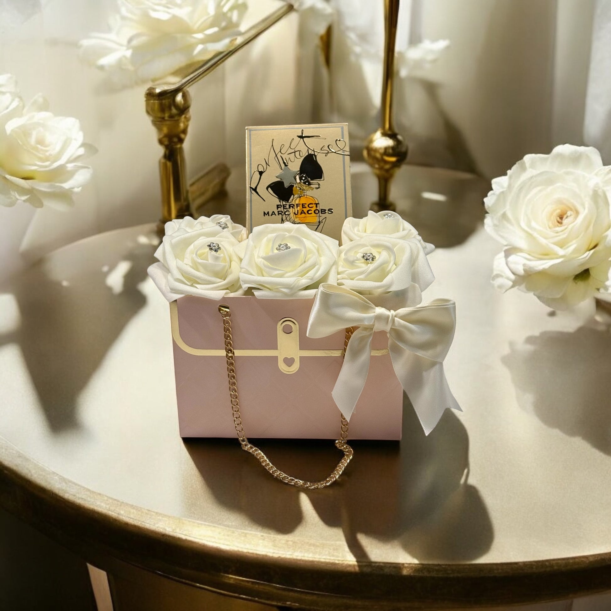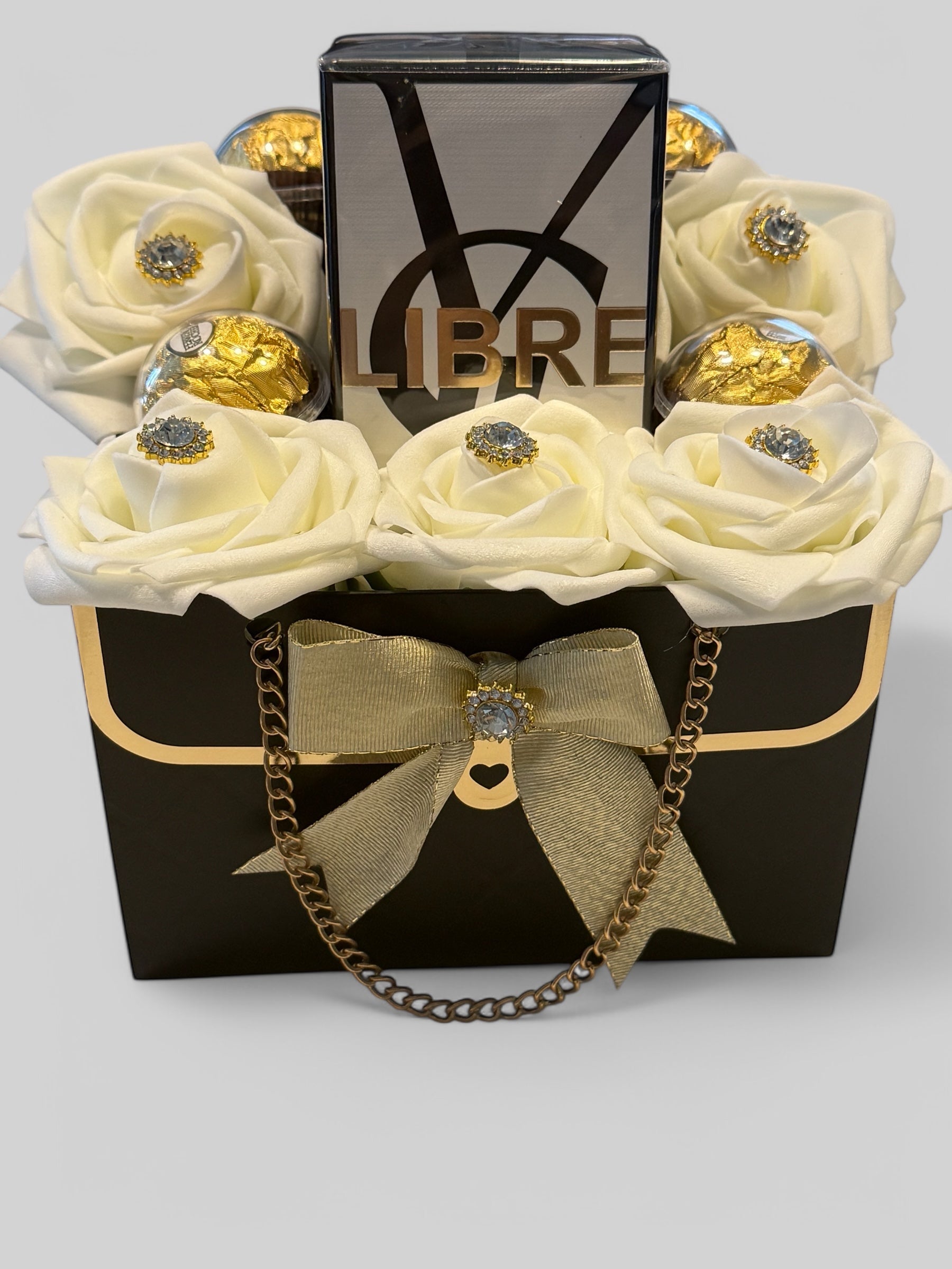 Beautifully arranged in an elegant floral handbag, this luxurious gift combines fragrance, timeless blooms and chocolates for an unforgettable experience.