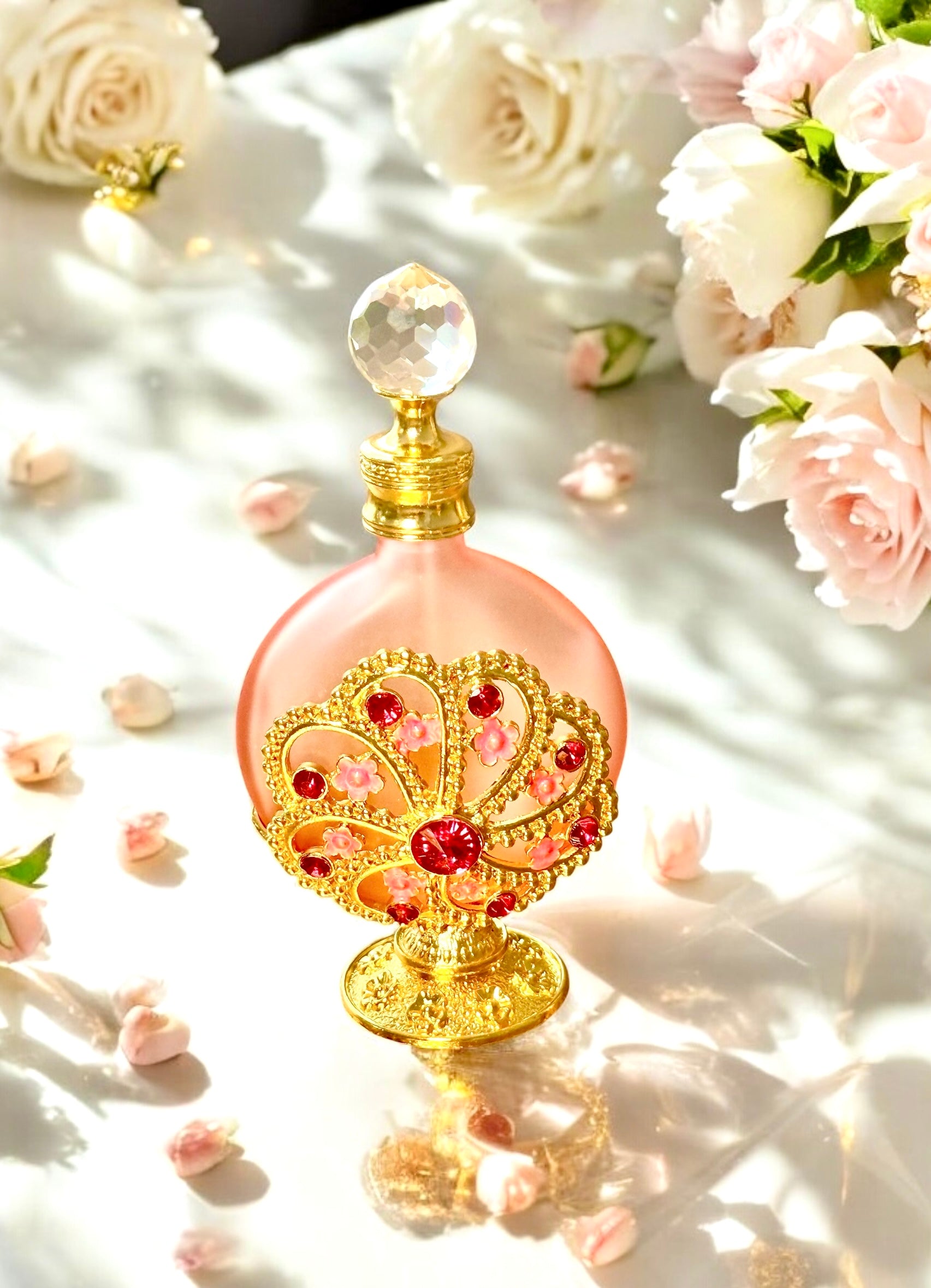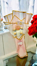 This is our signature "Iya ni Wura"-mother is gold rose bouquet. This selection is a beautifully arranged lifelike rose bouquet. Nestled inside is 30ml of exquisite fragrance oil imported from Dubai in a stunning keepsake jeweled bottle.