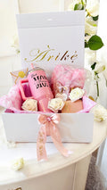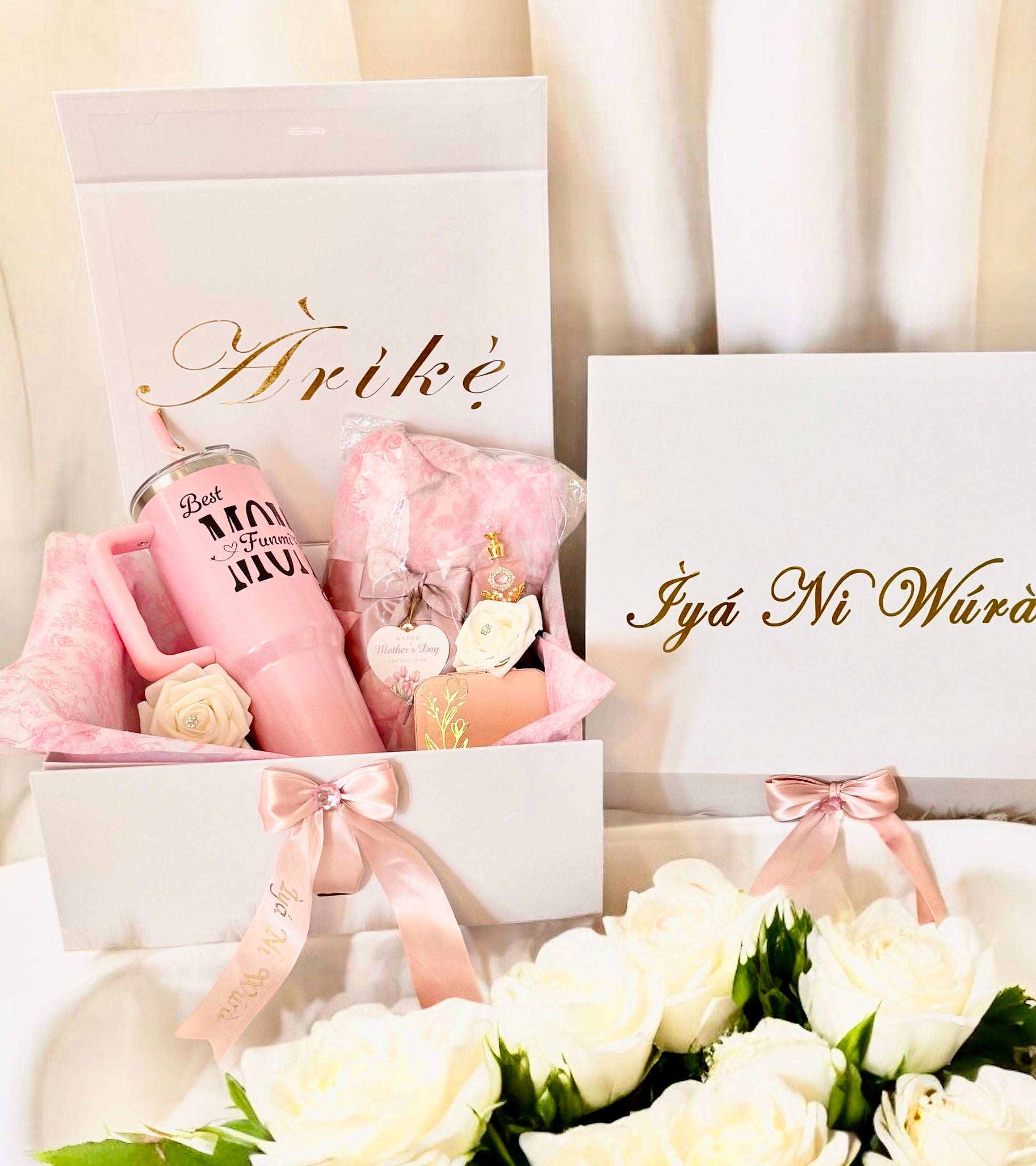 This is our ready-to-go "Iya ni Wura" Mother's Day gift box filled with our personalized signature package. Each box incudes a personalized 40oz tumbler, personalized travel jewelry case, personalized satin robe set and perfume oil imported from Dubai in a beautiful bottle. This box is a premium magnetic closure box measuring 13in x 11in x 5.3in