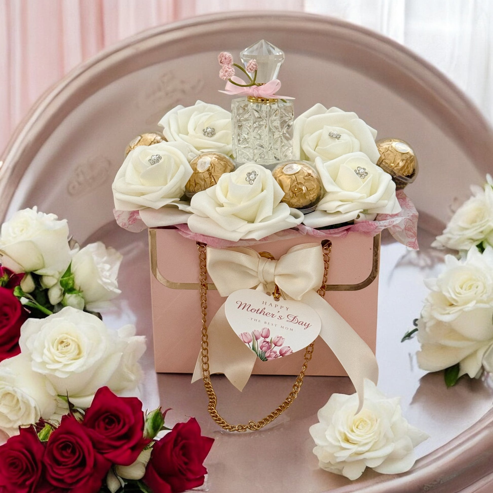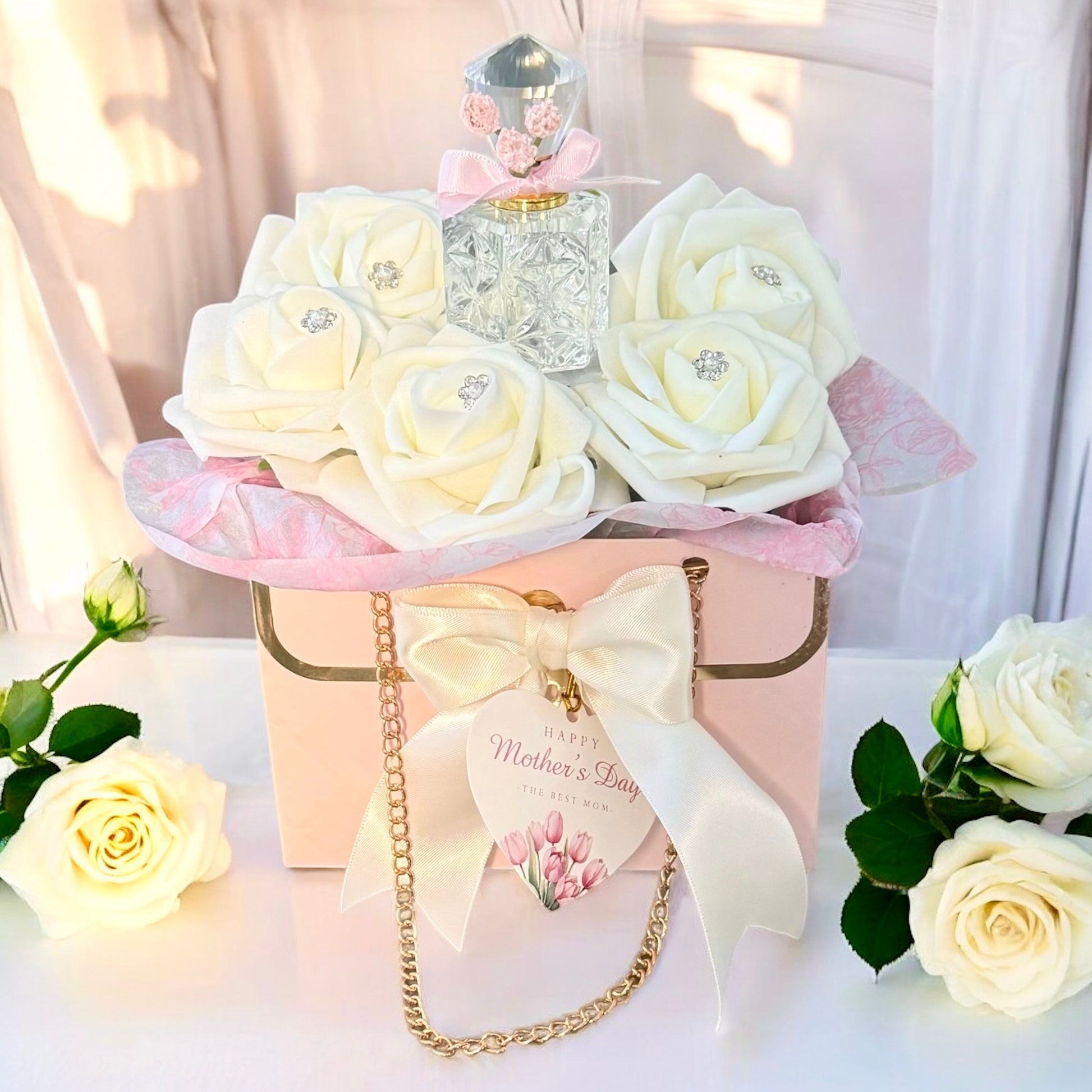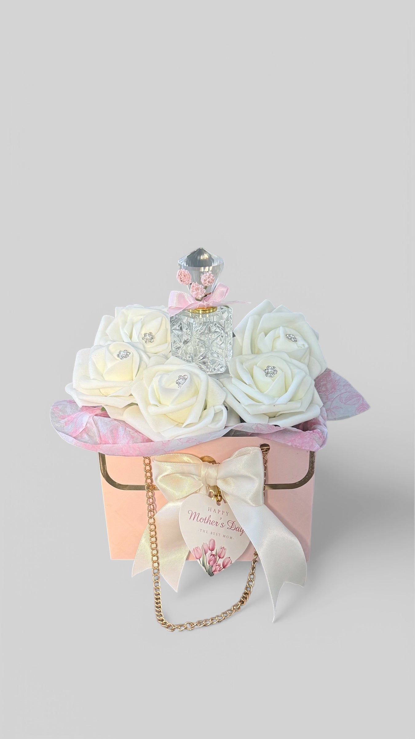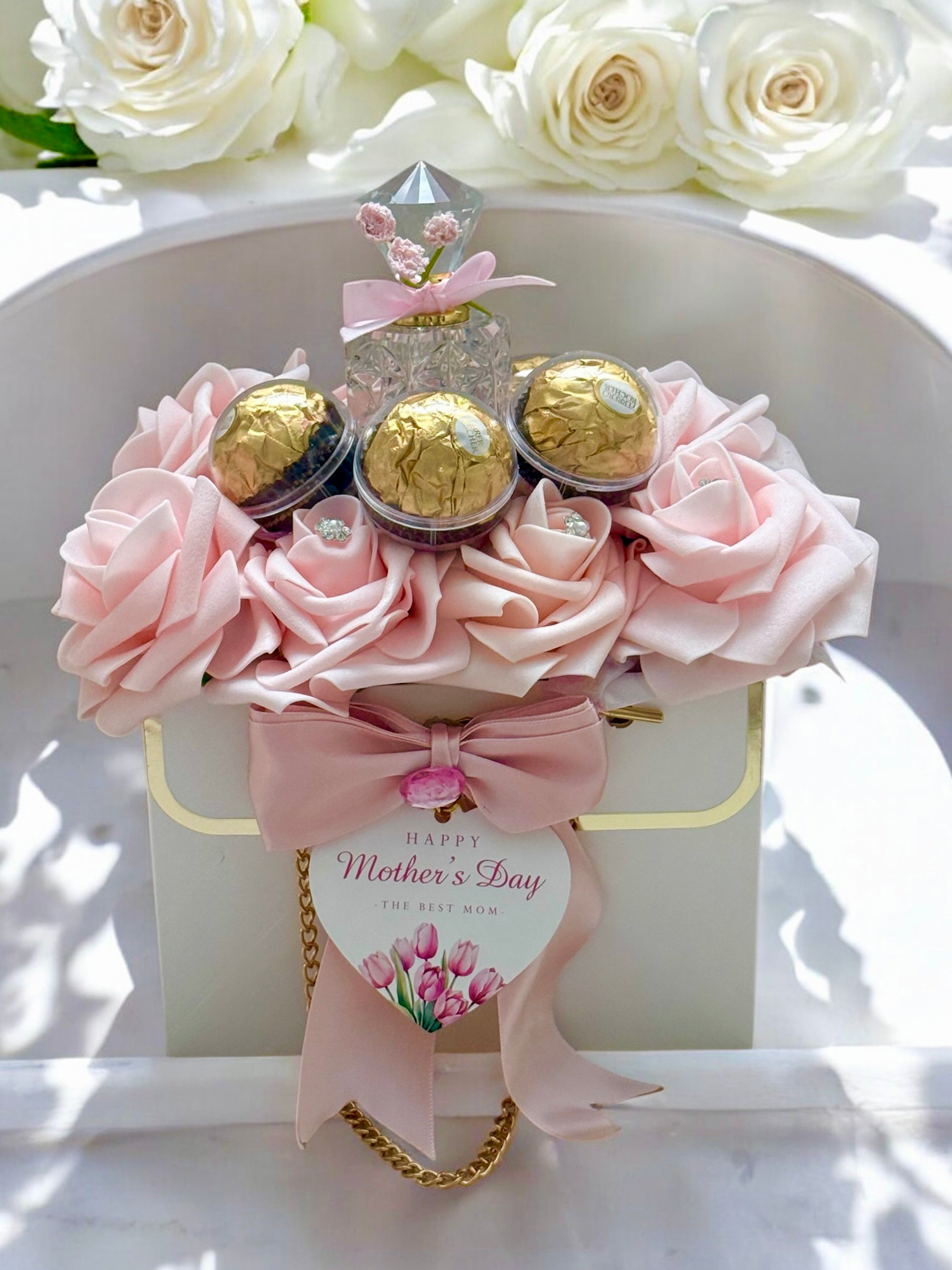 Inside our Mother's Day Flower Bag you will find a stunning crystal bottle with fragrance oil imported directly from Dubai. This premium fragrance offers a long lasting captivating scent that can be used alone or to layer with your favorite perfumes. You can choose to enhance this package by adding chocolates, adding a sweet treat to this gift.