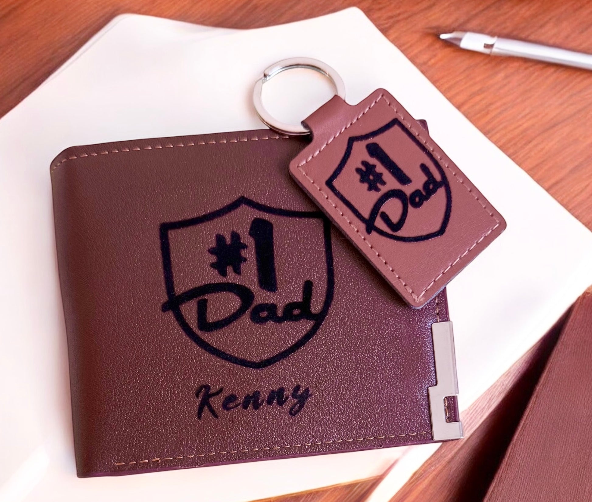 Celebrate Dad in style with this sleek, matching wallet and keychain duo, both personalized with his name. Durable, practical, and full of heart—this set is the perfect everyday reminder of how much he’s appreciated.